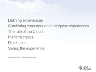 The document discusses the integration of consumer and enterprise experiences in mobile technology, emphasizing that mobile is now an essential aspect of competitiveness for companies. It highlights the importance of user-friendly design and seamless functionality across devices to enhance the mobile experience in the workplace. Key considerations include understanding user needs, delivering tangible benefits, and leveraging innovative capabilities of mobile technology.