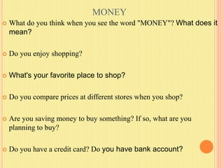 The document discusses money and its role in people's lives. It asks questions about how people view money, their shopping habits, saving habits, and whether money can buy happiness. It discusses common sayings related to money and plays a song called "Price Tag" about money. It asks the participants to comment on the video and song and write about their own views on the importance of money and if it can buy happiness.