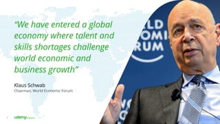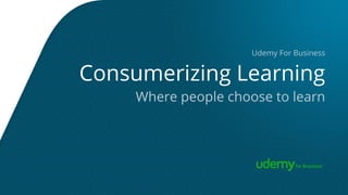 The document discusses the challenges of corporate training and the inadequacies of the traditional 70-20-10 learning model, highlighting that many employees lack the necessary skills for their jobs. It advocates for a consumerized approach to learning that is continuous, engaging, and accessible, emphasizing the importance of on-demand, updated content for effective employee development. Udemy for Business is presented as a solution offering a variety of courses aimed at meeting the learning needs of today's workforce.