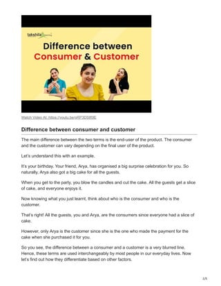 The document discusses the difference between consumers and customers. A consumer is defined as the end user of a product or service, while a customer is anyone who pays for a good or service. The main difference is that the consumer is the final user, while the customer pays but may or may not be the end user. An example is given of a birthday party where the guests (consumers) eat the cake but the friend (customer) who paid for the cake. Various types of customers are also outlined such as repeat customers, discount customers, and trade customers.