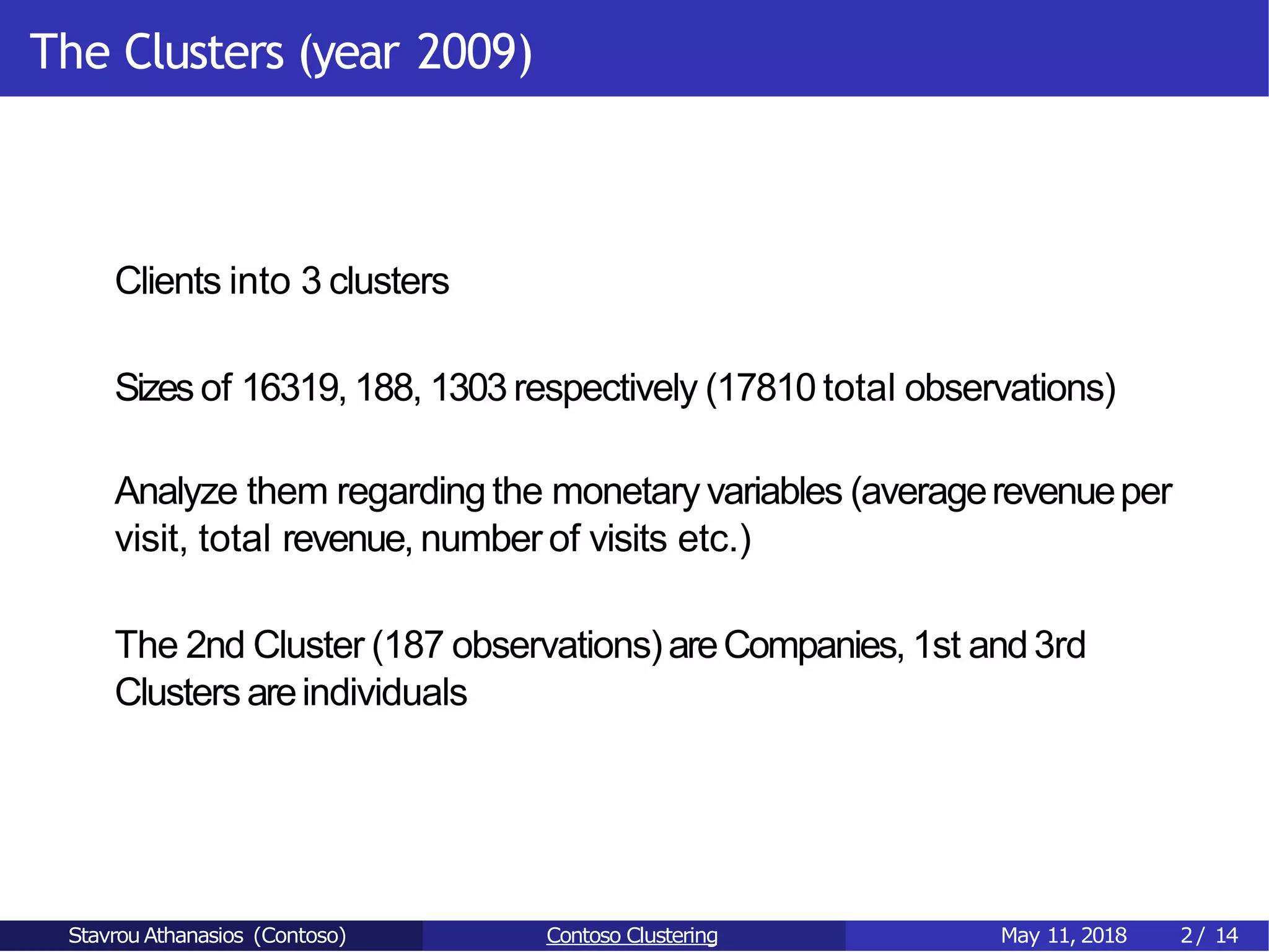 The document presents a clustering analysis of clients segmented into three clusters based on monetary variables, revealing distinct demographics and preferences. Cluster 1 consists mainly of individuals aged 30-49, while Cluster 2 comprises primarily companies, and Cluster 3 includes older individuals. Key findings suggest differences in purchasing behavior, with Cluster 1 focusing on washers/dryers and download games, while Cluster 2 has the highest revenue and diversified product preferences.