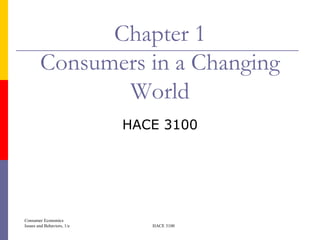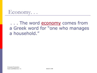 This document provides an overview of key concepts in consumer economics. It defines economics as the study of how society manages its scarce resources. Consumer economics specifically examines how people deal with scarcity by fulfilling needs and selecting among alternatives. The consumption process is discussed as a cycle of awareness of needs/wants, information gathering, planning purchases, implementing purchases, and evaluating the outcomes. Maslow's hierarchy of needs and the distinction between needs and wants are also introduced.