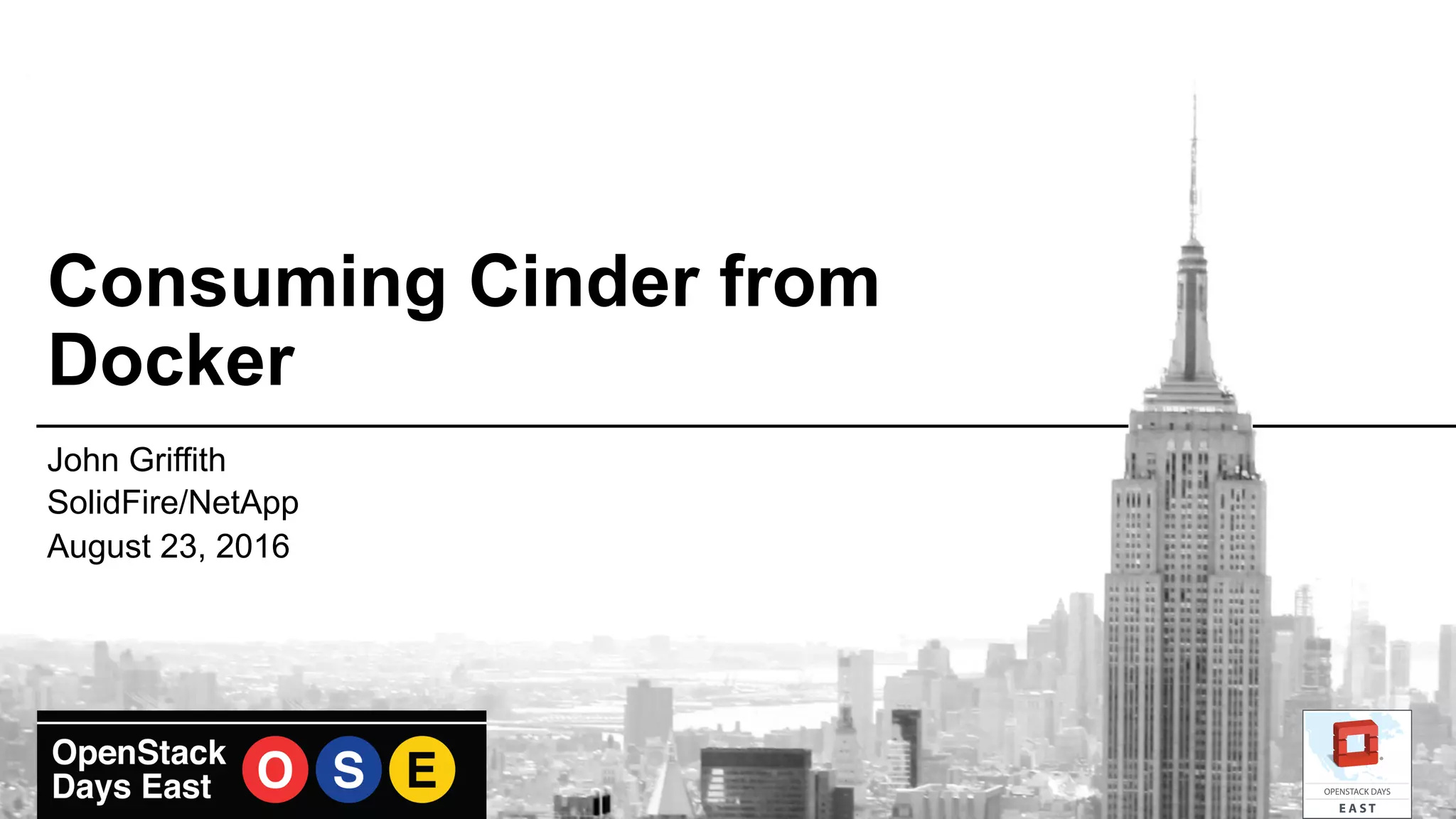 This document summarizes John Griffith's presentation about using Docker volume plugins with OpenStack Cinder block storage. Some key points: