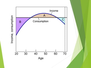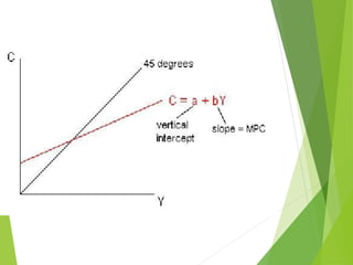 This document provides information on consumption, investment, and savings functions. It defines consumption as the use of goods and services by households. Investment is expenditures on capital goods for future income generation. Savings are disposable income left over after consumption expenditures. The document discusses consumption and investment functions, which relate these variables to income. It also outlines factors that determine consumption, investment, and savings like income, interest rates, and expectations. The document concludes with a case study comparing consumption functions in India and Iran.