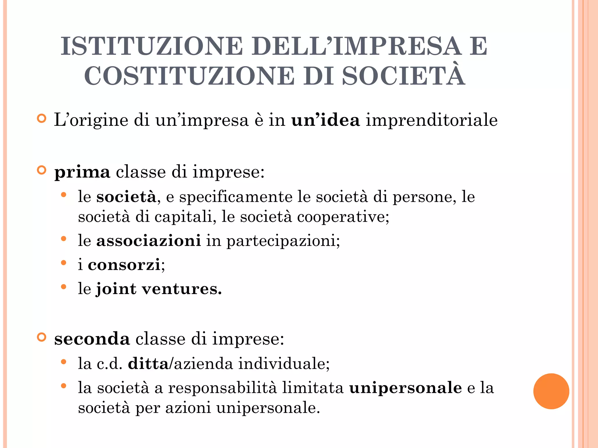 Il documento descrive la genesi e la struttura delle imprese, categoricamente suddivise in società e ditte individuali, evidenziando la differenza di responsabilità e gestione. Analizza anche gli apporti iniziali, la valutazione del patrimonio, e i requisiti burocratici per la costituzione e la gestione delle imprese. Infine, si sofferma sugli obblighi contabili e sulla composizione del patrimonio netto nel periodo di esercizio.