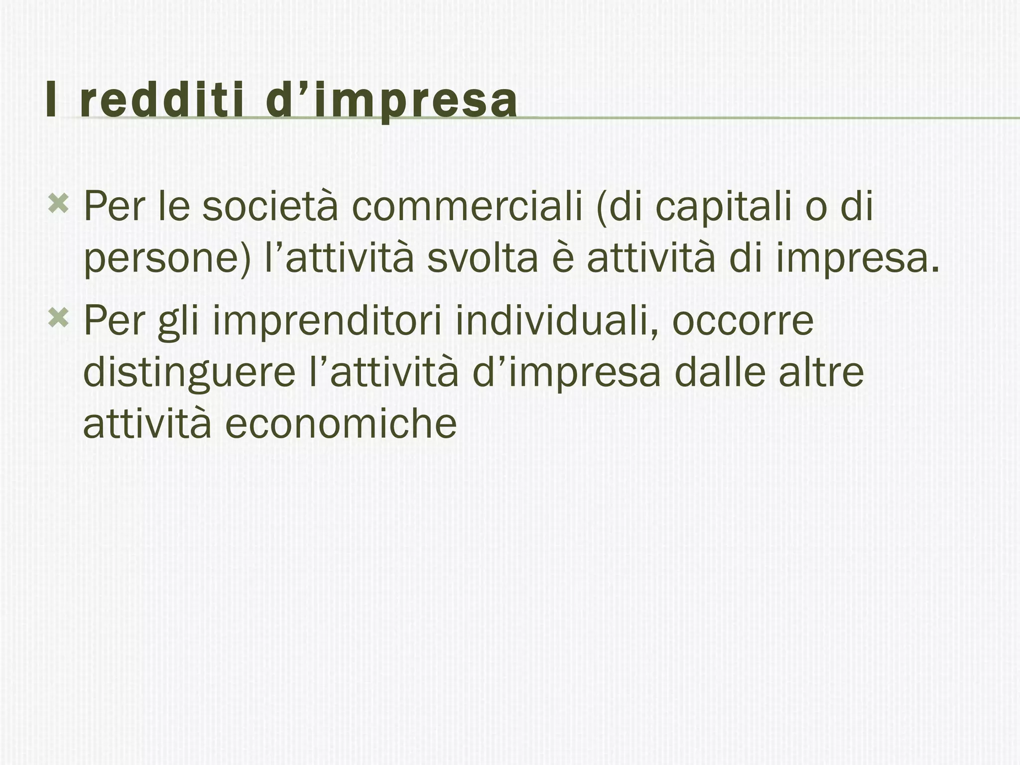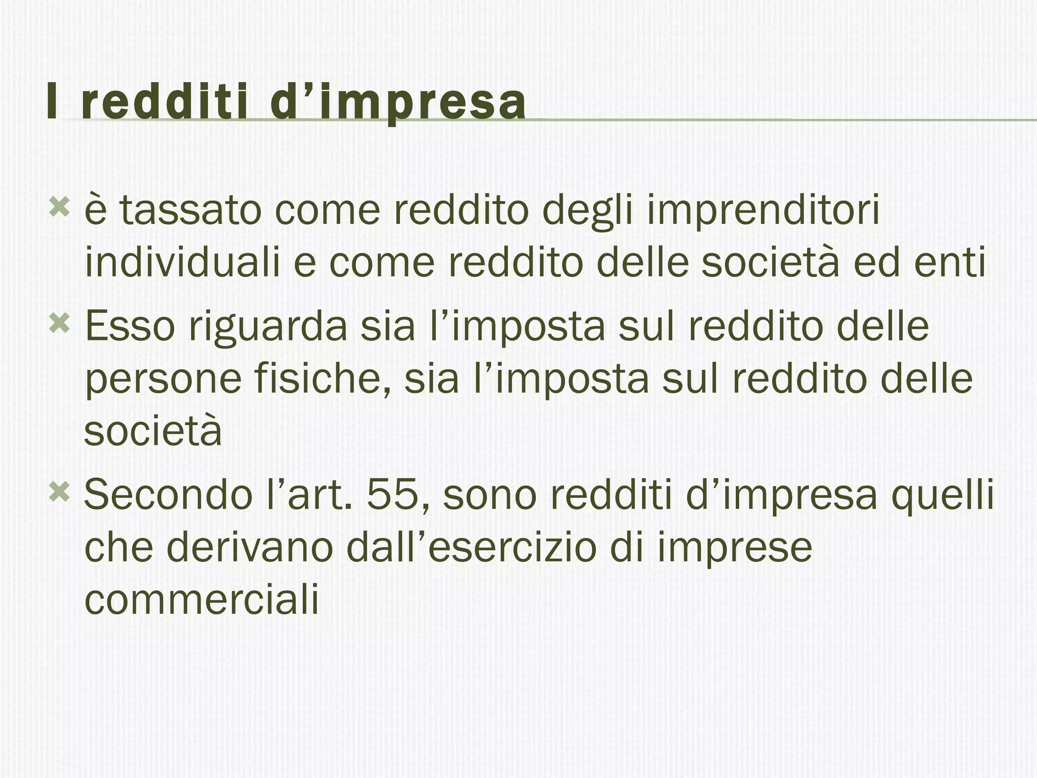 Il documento tratta della tassazione dei redditi d'impresa, evidenziando le normative fiscali e i principi contabili applicabili per imprese individuali e società. Viene descritto il calcolo del reddito d'impresa, l'importanza della correlazione costi-ricavi, e le norme relative alla deducibilità di vari costi e ricavi. Inoltre, si analizzano le plusvalenze, le sopravvenienze attive e le regole di deducibilità legate agli investimenti e ai beni strumentali.