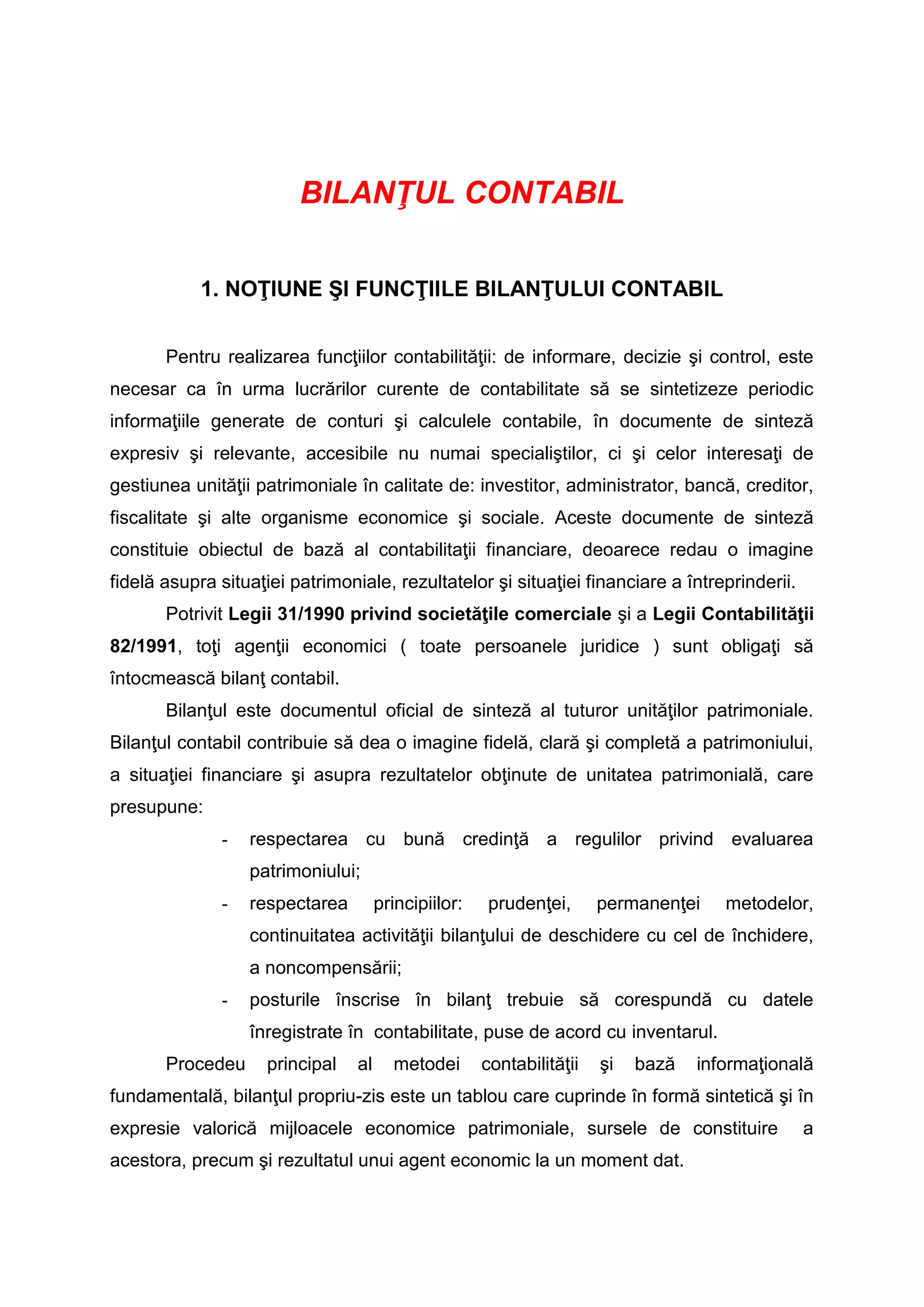 Bilanțul contabil este un document oficial de sinteză care oferă o imagine fidelă asupra situației patrimoniale și financiare a unei întreprinderi, fiind obligatoriu pentru toate agențiile economice. Acesta include activele și pasivele, este structurat conform regulilor contabile, și funcționează ca un instrument esențial pentru analiza activității economice și previzionare. Bilanțul trebuie să fie completat periodic cu anexe și rapoarte de gestiune pentru a reflecta corect evoluția financiară a unității patrimoniale.