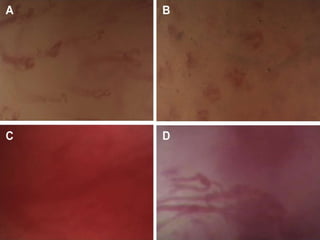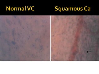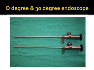 This document describes contact endoscopy (CE), a non-invasive optical technique that uses a magnifying endoscope to provide real-time visualization and examination of the cellular architecture and vascular patterns of mucosal tissues. CE allows in vivo assessment of precancerous and cancerous lesions without biopsy. Several contact endoscope models from Karl Storz are described. The document outlines CE's applications in examining various head and neck tissues and its ability to detect abnormalities. The benefits of CE include its non-invasive nature, ability to examine large areas quickly, and provision of immediate results.