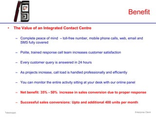 This document discusses how a professional contact centre can increase sales response rates by up to 50% by efficiently handling customer queries through multiple channels like phone, email, SMS and effectively managing customer interactions from lead generation to conversion. It promotes a contact centre solution that provides a unified view of all customer communications and interactions to help businesses better serve customers and boost sales.