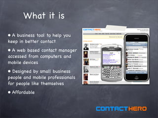 Contact Hero is a web-based contact management tool designed for small business and mobile professionals, allowing users to keep better contact and organize leads efficiently. It features a dashboard that tracks calls and contacts, integrates with various email services, and offers scheduling tools to enhance follow-ups, ultimately aiming to increase sales and prevent lost opportunities. The service costs $9.95 per month after a 30-day free trial and includes SSL encryption, ensuring data security without lock-in contracts.