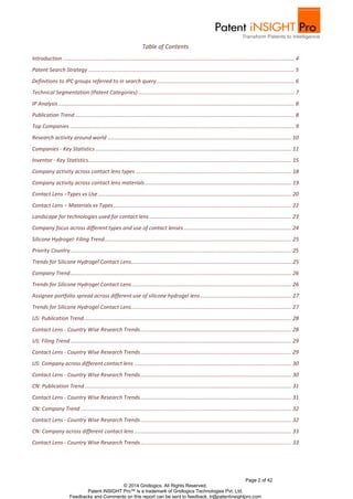 The contact lenses technology insight report provides a comprehensive analysis of patents related to contact lenses published over the past 20 years. It discusses trends, types, materials, and innovation in contact lens technology, as well as key companies involved in this field. The report includes data on patent publication trends, and focuses on regional activity, top companies, and various contact lens applications and technologies.