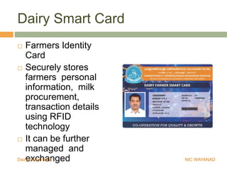 The Wayanad Dairy Smart Card is an RFID-enabled identity card for dairy farmers that securely stores personal information, milk procurement details, and transaction records. It facilitates transactions at the doorstep and reduces errors and fraud by replacing conventional passbooks with digital records. The implementation of the card is underway, with pilot programs and ongoing enrollments in progress in various districts.