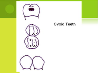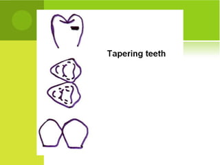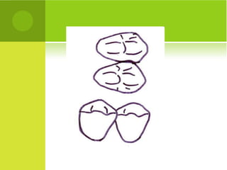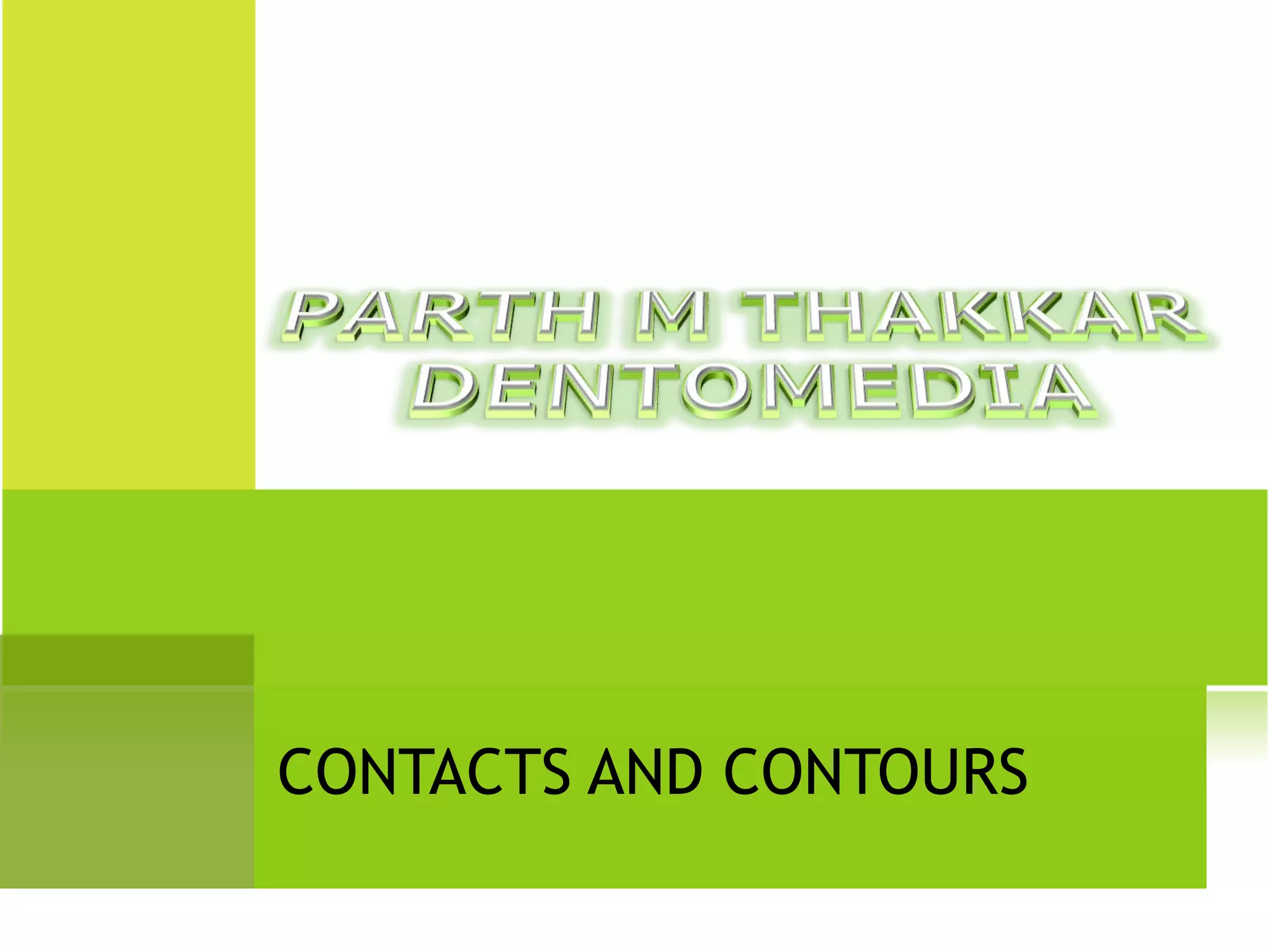 The document discusses dental contacts and contours. It defines contacts as the proximal heights where the mesial or distal surfaces of teeth touch. Contacts broaden over time through wear. Properly located contacts support interdental papilla and stabilize the dental arches. Contours are the convexities and concavities on facial/lingual surfaces that protect supporting tissues during chewing. The greatest convexities vary by tooth type but generally occur at the gingival third or middle third. Convexities and concavities guide occlusion and food passage. Faulty contacts or contours can lead to food impaction, plaque accumulation, and periodontal disease.