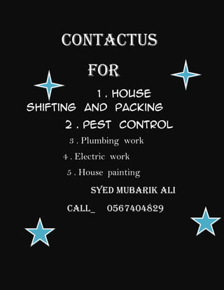 This document provides contact information for various home services including house shifting and packing, pest control, plumbing work, electric work, and house painting. The contact person is Syed Mubarik Ali and his phone number is 0567404829.