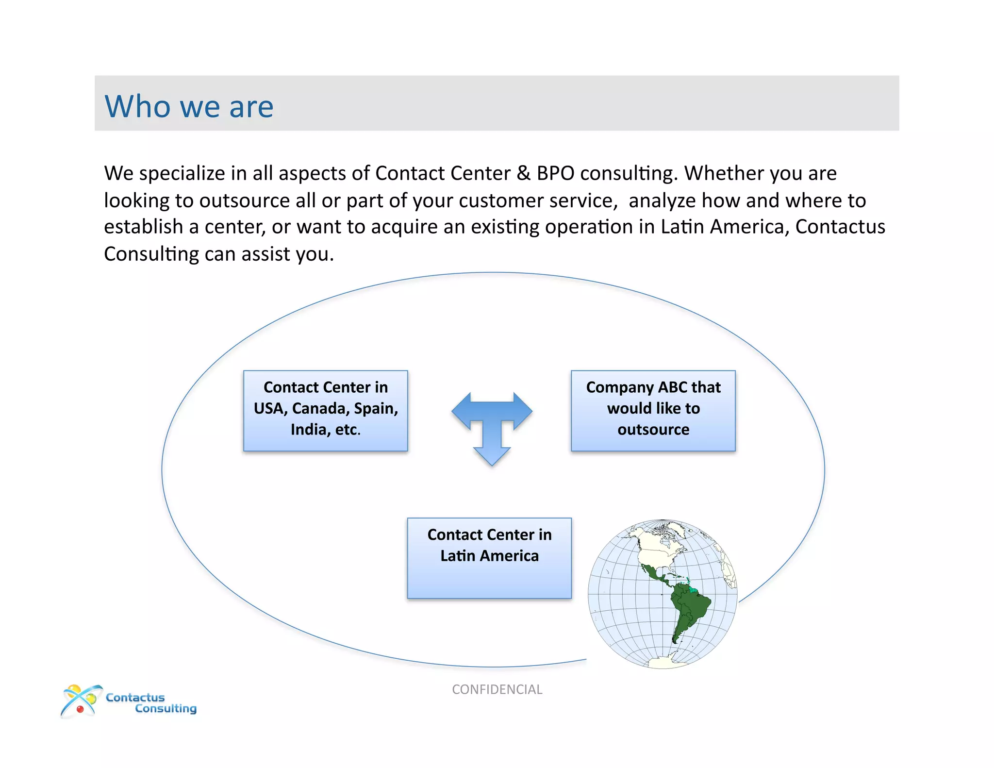 This document provides an overview of Contactus Consulting, a firm that specializes in contact center and BPO consulting services in Latin America and the Caribbean. They offer outsourcing opportunities and partnerships to contact centers looking to expand operations abroad. Their services include analyzing options for establishing new contact centers, acquiring existing operations, and partnering with centers in Latin America to prepare them to offer outsourcing services and achieve business goals through their Contact Center Optimization Program. They represent various contact centers that can host or partner with other businesses.