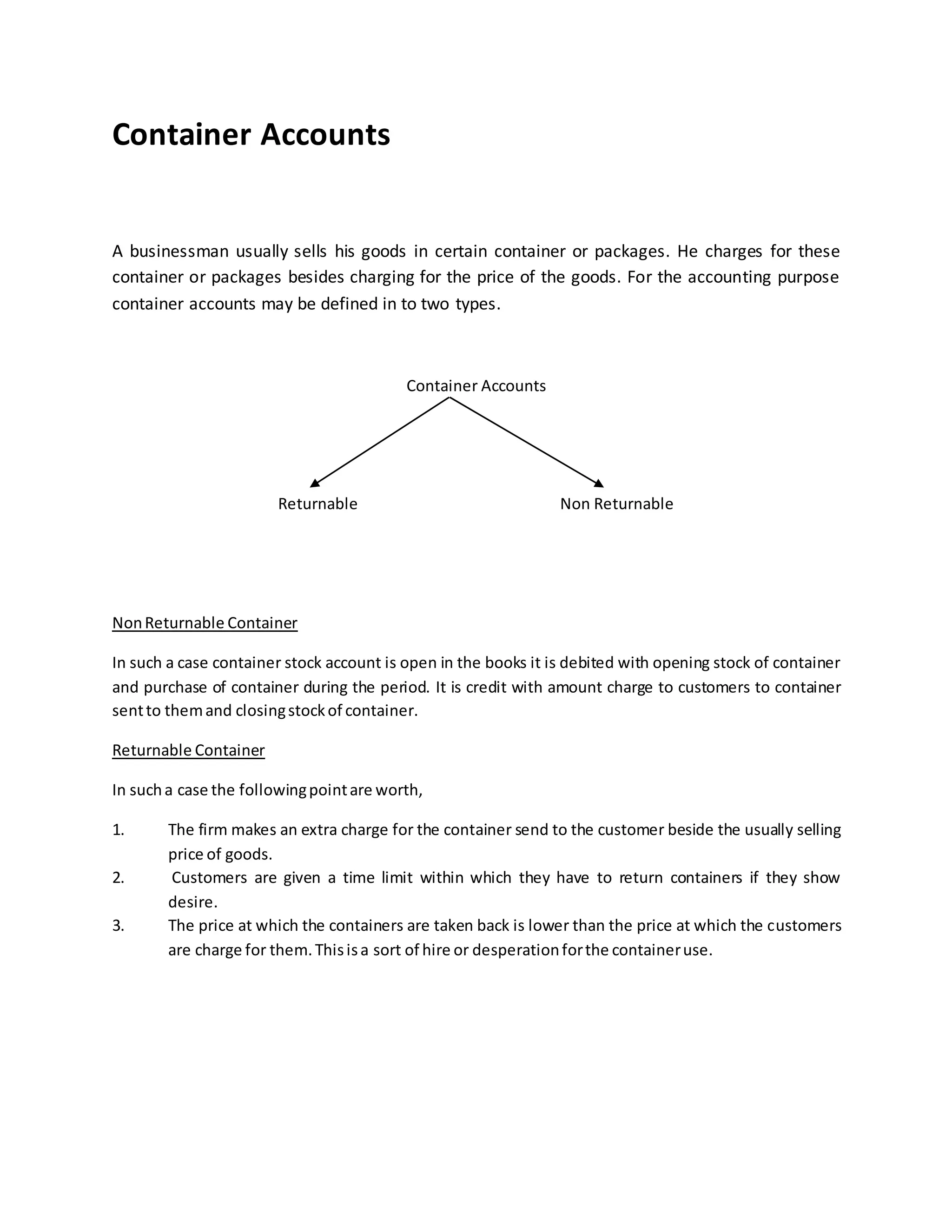 2. Four types of container accounts are described: container stock, container trading, container debtors, and container reserve/suspense accounts. These track container inventory, profit/loss on containers, amounts owed by debtors for containers, and reserves for containers not yet returned.