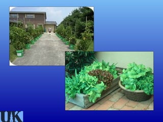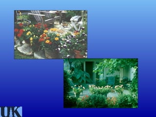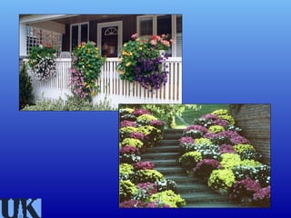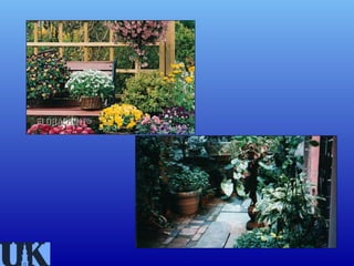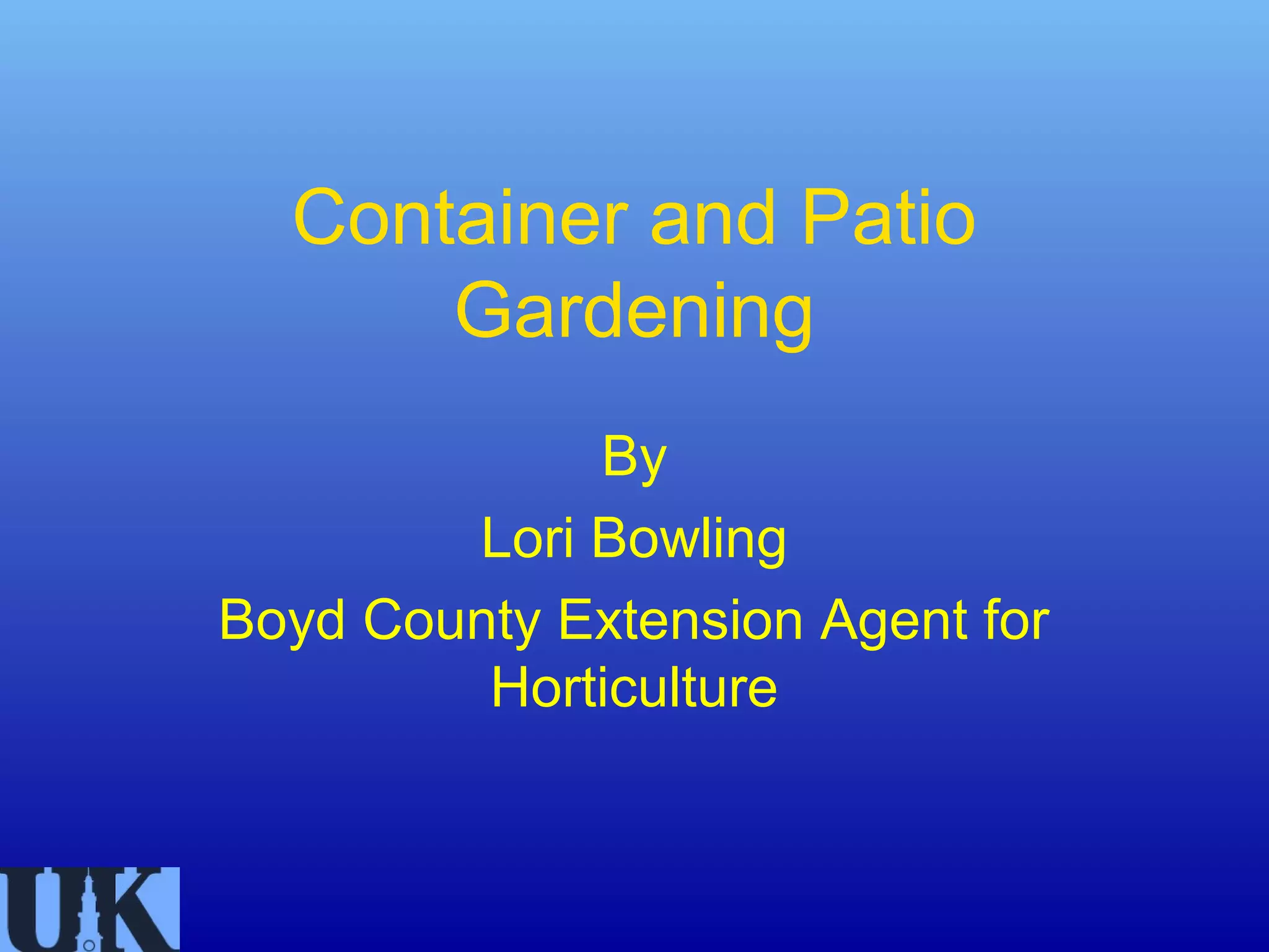 This document provides information on container and patio gardening. It discusses why people garden in containers, including limited space, time, mobility issues, unsuitable garden sites, and for decorative purposes. It covers container types and requirements including size, drainage, and temperature considerations. The document also discusses potting media requirements for structure and drainage. It provides tips on selecting plants for containers based on their sun, water and space needs. Specific plant types that work well in containers are also outlined, including vegetables, annuals, perennials, trees and aquatic plants. Maintenance of containers like watering and repotting is also addressed.