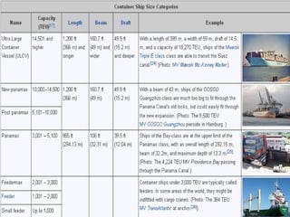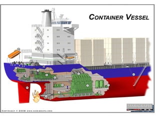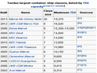Container ships are specialized cargo vessels that transport goods in intermodal containers, enhancing the efficiency of freight transport. Containerization has significantly improved the shipping process, reducing time by 84% and costs by 35%. The capacity of container ships is measured in twenty-foot equivalent units (TEU), with a few major manufacturers dominating the market.