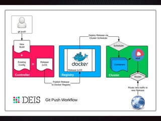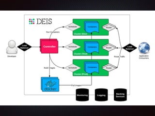 The document discusses the concept of containers in software deployment, emphasizing Linux containers as a method for resource isolation and application packaging. It highlights the benefits of using containers, including ease of use and consistency across environments, as well as the 12-factor app principles. Additionally, it touches on future steps and current tools like Deis and Docker, while mentioning emerging technologies such as Kubernetes and Mesos.