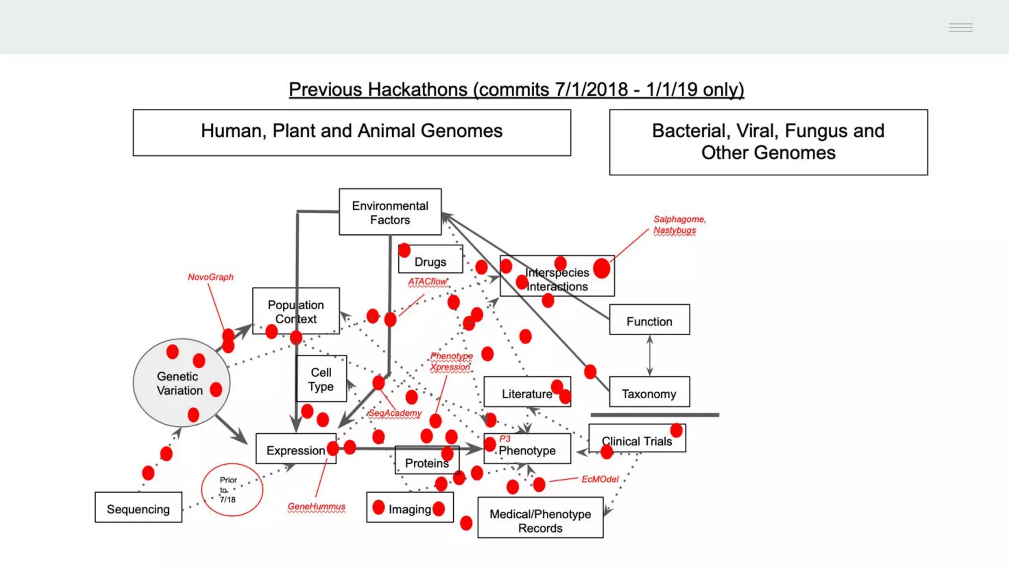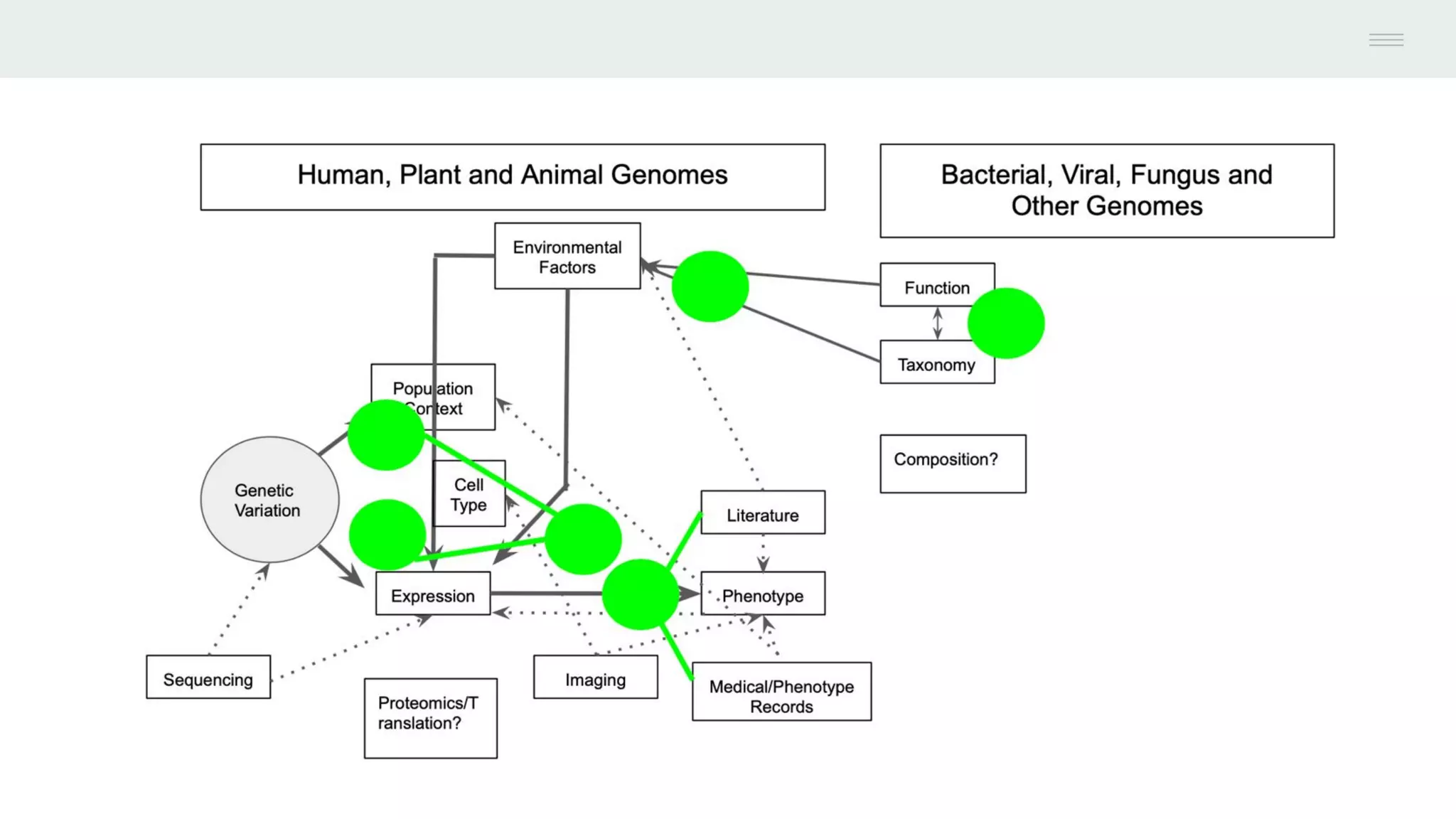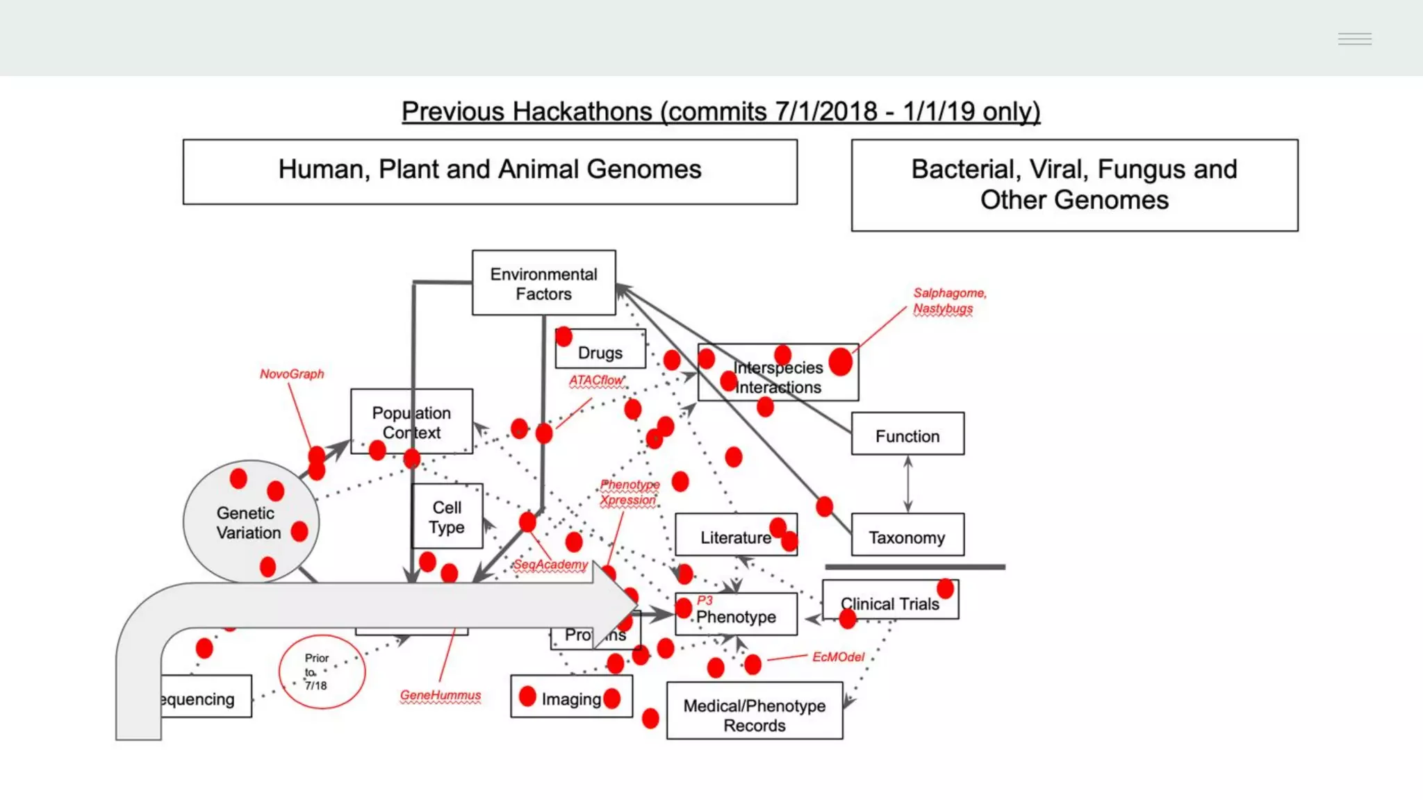 This document discusses federating genomic sequencing data across cloud platforms for discovery. It presents four topic areas as examples: 1) virus characterization and discovery through building an index of viral signatures, 2) generating systems to analyze genome graphs to compare individuals to communities, 3) annotating haplotypes and graphs to query complex disease, and 4) indexing data flexibly for federated discovery anywhere through APIs. It emphasizes that metadata is needed to contextualize data and maximize its utility for answering biological questions.