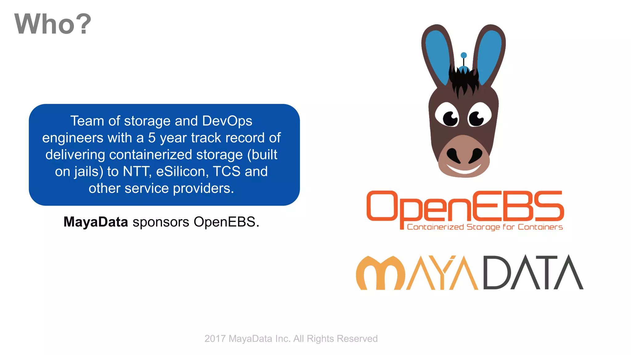 The document describes a presentation about OpenEBS, a containerized storage solution for containers. OpenEBS provides storage that is container-native, allowing storage for containerized applications to be containerized itself. It delivers features like data protection, snapshots, and eliminates lock-in to specific cloud vendors or storage vendors. Maya is a control plane that can manage OpenEBS storage across multiple clouds, providing visibility, automation, and over time machine learning capabilities.