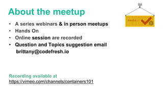 This document provides an overview of a webinar on Docker containers. It introduces Docker terminology like images and containers. It discusses how Docker provides isolation while running on a single shared kernel. It also outlines some benefits of Docker for development teams like continuous integration and parallel testing. Finally, it announces there will be a live demo and Q&A on Docker basics, benefits, and using Docker Compose.