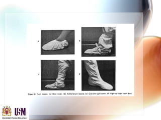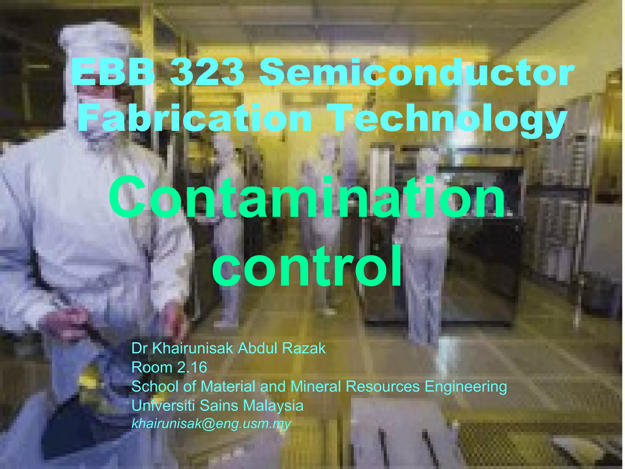 This document discusses contamination control in semiconductor fabrication. It identifies five major classes of contaminants: particles, metallic ions, chemicals, bacteria, and airborne molecular contaminants. Contamination can reduce device yield, affect performance and reliability. Sources of contamination include air, the production facility, cleanroom personnel, process water, chemicals, gases and static charge. The document describes techniques for maintaining cleanliness, such as cleanrooms, air filtration, garment protocols and chemical purification. It also outlines requirements for wafer cleaning and differences between front-end-of-line and back-end-of-line processing.