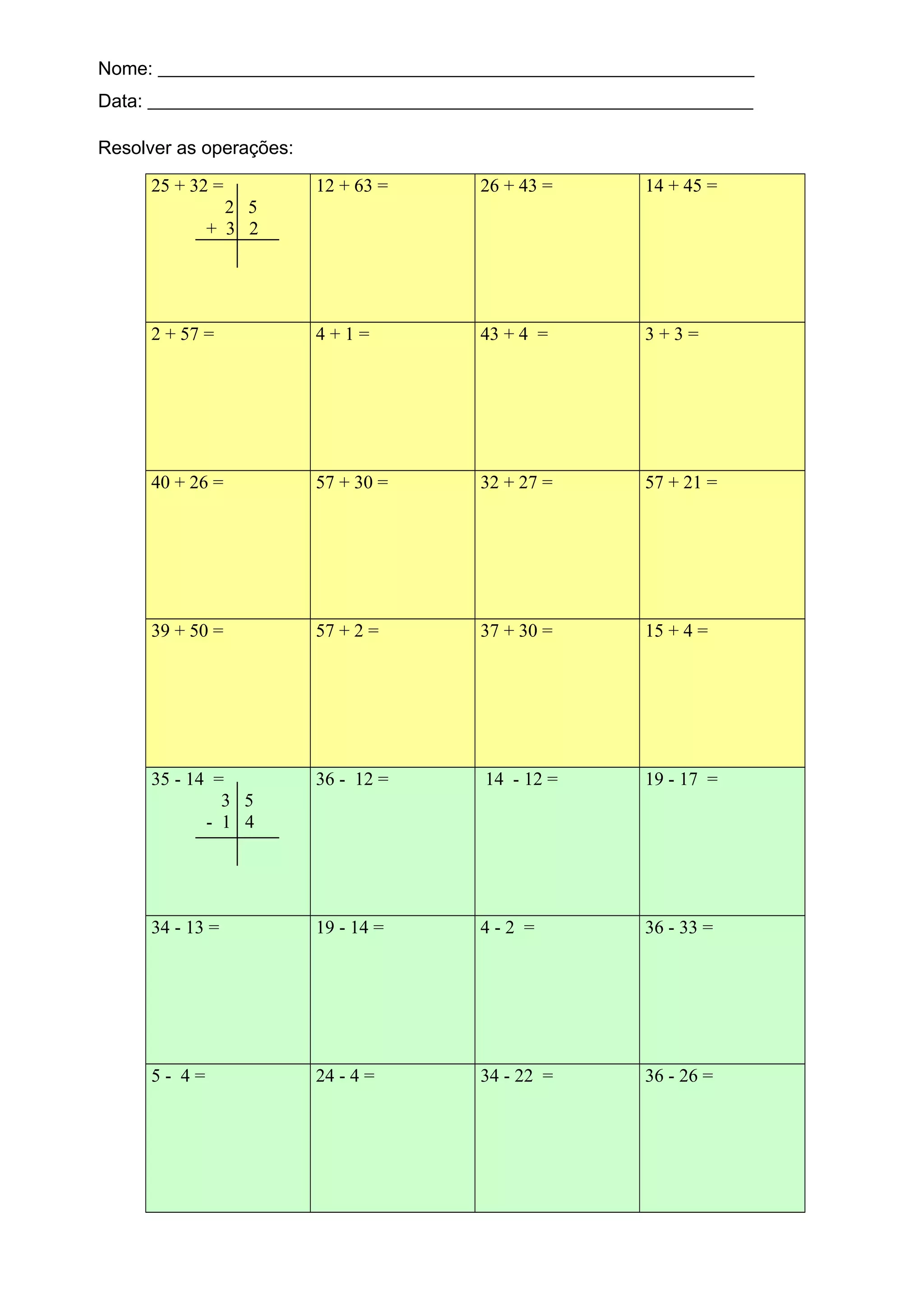 This document contains math word problems for students to solve. It lists addition, subtraction, and equality problems involving single-digit and double-digit numbers, such as 25 + 32, 14 - 12, 26 = 43, and 5 - 4. The student is asked to solve the problems by writing out the calculations.