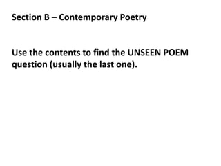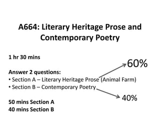 This document provides information about an exam assessing literary heritage prose and contemporary poetry. The exam is 1 hour and 30 minutes long, with 60% of the marks coming from a section on Animal Farm and 40% from a contemporary poetry section. In the poetry section, students will answer an question about an unseen poem, exploring how the poet vividly portrays the power of the wind through the language, sounds, structure and effects used. The document provides guidance on how to plan and structure an answer to the unseen poetry question.