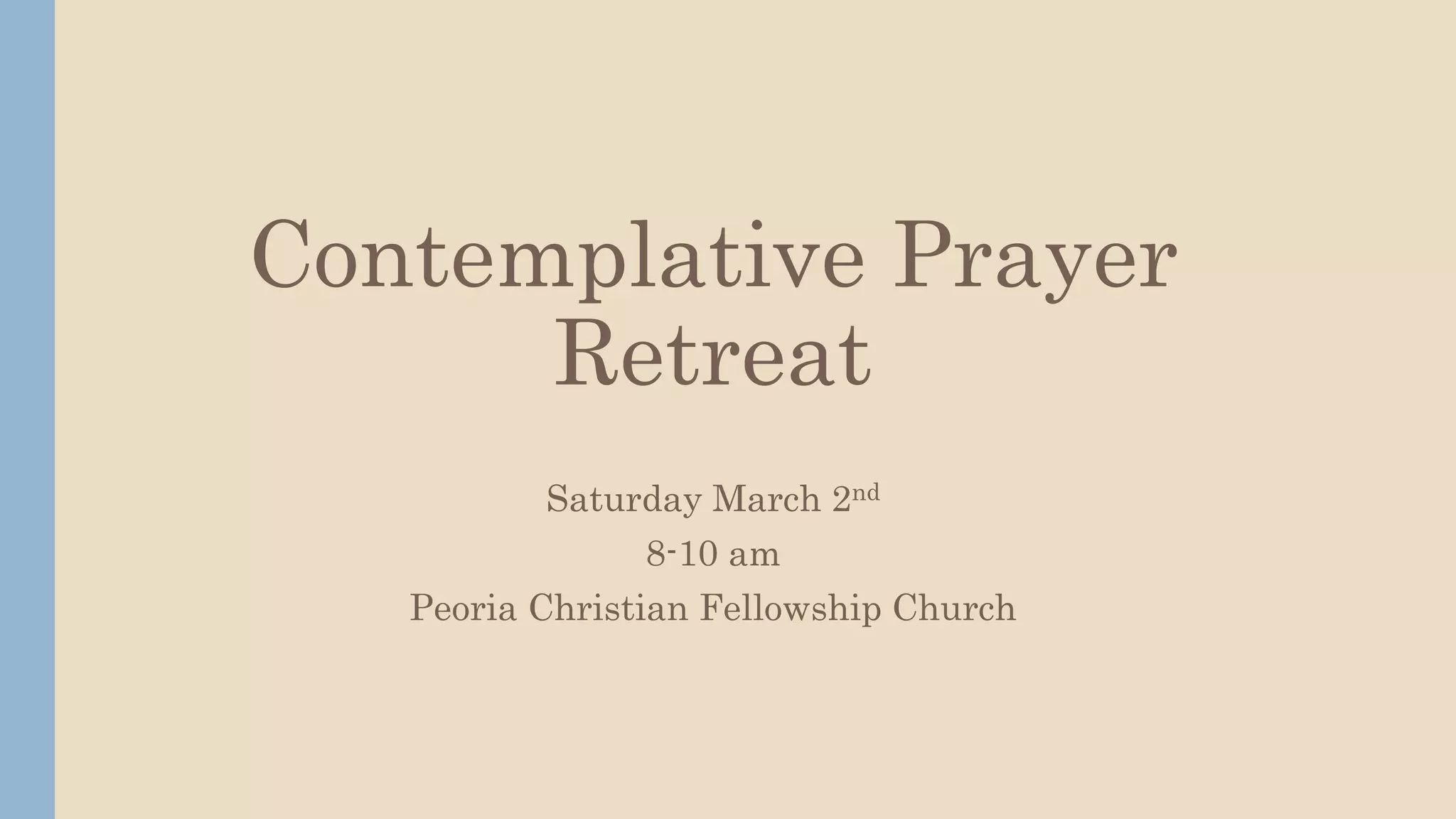 A contemplative prayer retreat will be held on March 2nd from 8-10 am at Peoria Christian Fellowship Church. The retreat will focus on dealing with fear and will include two prayer sessions looking at Jesus in the garden of Gethsemane and a passage from Philippians. The agenda includes an introduction, two prayer sessions with biblical passages, a break for questions and answers, and time for journaling and closing blessing. Various prayer types such as centering prayer, prayer of invitation, and prayer of exam will be used. Additional prompts on the presence of God, freedom, and discerning God's voice will also be provided.