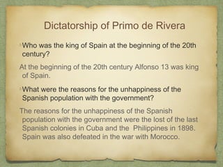 During the early 20th century, Spain was unhappy with the monarchy due to losses of colonies and wars. This led to a coup in 1923 where Primo de Rivera became dictator and banned political parties. In 1931, the Second Spanish Republic was proclaimed, establishing reforms like women's suffrage. However, a civil war broke out in 1936 between Republican and Nationalist groups, led by Francisco Franco. Franco emerged victorious in 1939 and established a dictatorship until his death in 1975, repressing opposition and restricting freedoms for several decades.