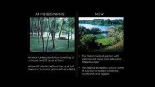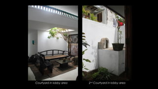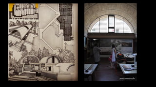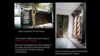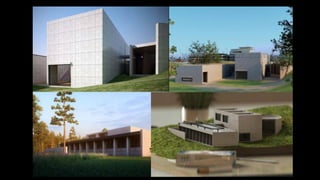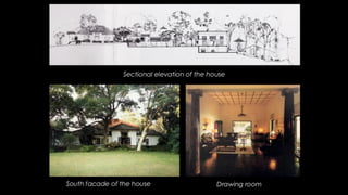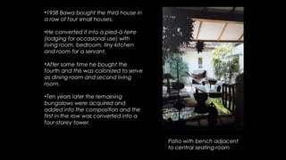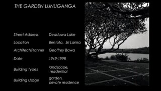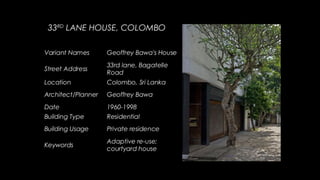 Geoffrey Bawa was a Sri Lankan architect known for tropical modernism. He respected local context and culture, using vernacular elements like courtyards and roof forms. Bawa's buildings had a play of light and shade and flowed between indoor and outdoor spaces. Hassan Fathy was an Egyptian architect who designed low-cost buildings using local materials and labor. He trained locals to reduce costs while reviving ancient Egyptian design. Tadao Ando is a Japanese architect known for bare concrete and precise geometry. He uses light, water, and spatial circulation to define simple yet complex spaces. Balkrishna Doshi combines modernism with local context and traditions in India. He emphasizes natural light, ventilation, and