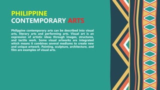 Philippine contemporary arts can be described as visual arts, literary arts, and performing arts. Visual arts include painting, sculpture, architecture, and film. Some examples of paintings, sculptures, architectural structures, and films from different regions of the Philippines are provided. Literary arts in the Philippines are expressed through different forms of writing, including poetry, prose, and drama. Several literary works from Luzon, Visayas, and Mindanao are listed. Performing arts encompass music, theater, and dance. Specific musical genres, theater plays, and dances originating from different parts of the country are mentioned.