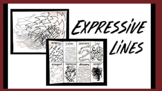 This document provides an overview of the elements and principles of art, focusing on lines. It defines line as an element of art that is used to define shape, contours, and outlines. It then classifies different types of lines such as outlines, contour lines, expressive lines, sketch lines, calligraphic lines, and implied lines. The document provides examples of each type of line and their characteristics.