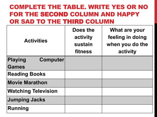 This document contains information about physical activities and their effects on fitness and mood. It includes a table to fill out indicating whether various activities sustain fitness and one's feelings about them. It then lists some warm-up exercises and their benefits. Finally, it provides information about contemporary dance, including its history, elements, pioneers, basic steps and techniques.
