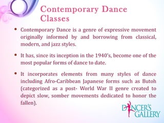 Contemporary dance is an expressive genre that evolved since the 1940s, blending elements from classical, modern, and jazz styles, along with influences from other forms like butoh. It emphasizes creativity and diversity, appealing to performers and beginners alike. Dancer's Gallery offers contemporary dance classes aimed at nurturing the innate abilities of dancers in a creative environment.