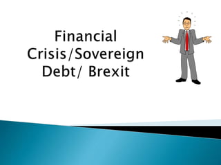 The document outlines various economic states such as recovery, boom, recession, and depression, focusing on major variables like industrial production, employment, and bank credit. It also discusses financial crises, highlighting causes such as excessive borrowing and the effects on national economies, particularly during events like the European debt crisis and Brexit. Additionally, it explains the implications of these economic situations on GDP and fiscal conditions in countries including the U.S., Germany, and the UK.