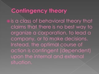 The document discusses several theories related to management and organizational behavior, including contingency theory, technology determinism, and stakeholder theory. Contingency theory claims there is no single best way to organize and that the optimal approach depends on internal and external factors. Technology determinism argues technologies directly impact organizational attributes like span of control. Stakeholder theory identifies six groups that influence organizations: technology, suppliers, customers, government, unions, and consumer groups.