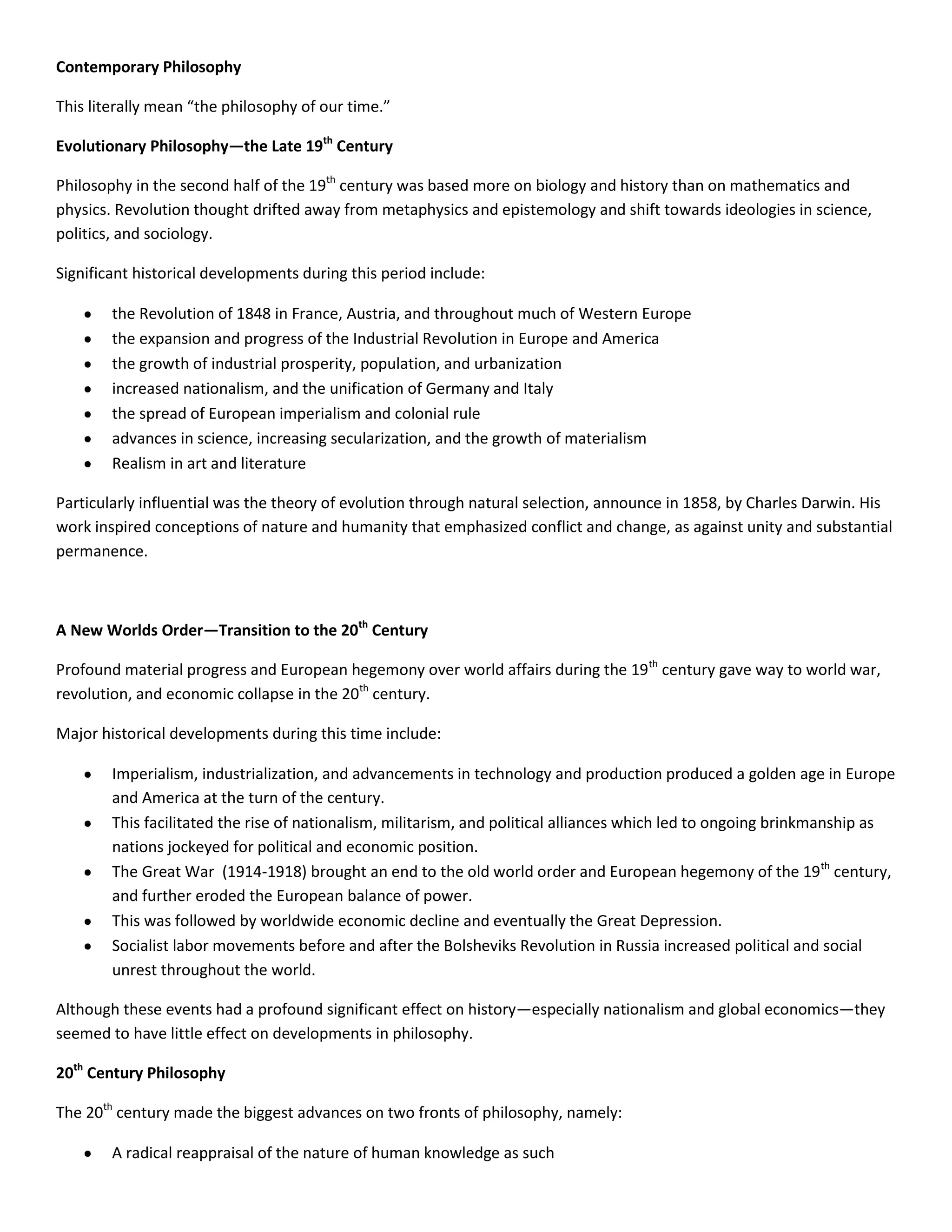 This document discusses the evolution of philosophy from the late 19th century through the 20th century. It describes how 19th century philosophy shifted away from metaphysics and epistemology towards ideologies influenced by advances in science. Significant historical events of the late 19th century included the industrial revolution and rise of secularism. The theory of evolution profoundly impacted conceptions of humanity. The early 20th century saw the collapse of the old world order through world wars and economic crises. While these events transformed history, 20th century philosophy focused on reexamining the nature of human knowledge and understanding the human condition in a non-religious universe.
