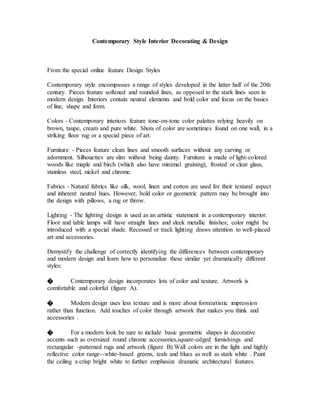 Contemporary interior design features neutral color palettes, clean furniture lines, and natural fabrics. Interiors contain toned-down elements and bold accents of color. Lighting is used artistically with straight lamps in sleek finishes. Contemporary design incorporates texture and colorful artwork for comfort, while modern design emphasizes form over function with geometric shapes and stark whites. Ceiling colors in contemporary homes are customized with a touch of wall color mixed into white paint.