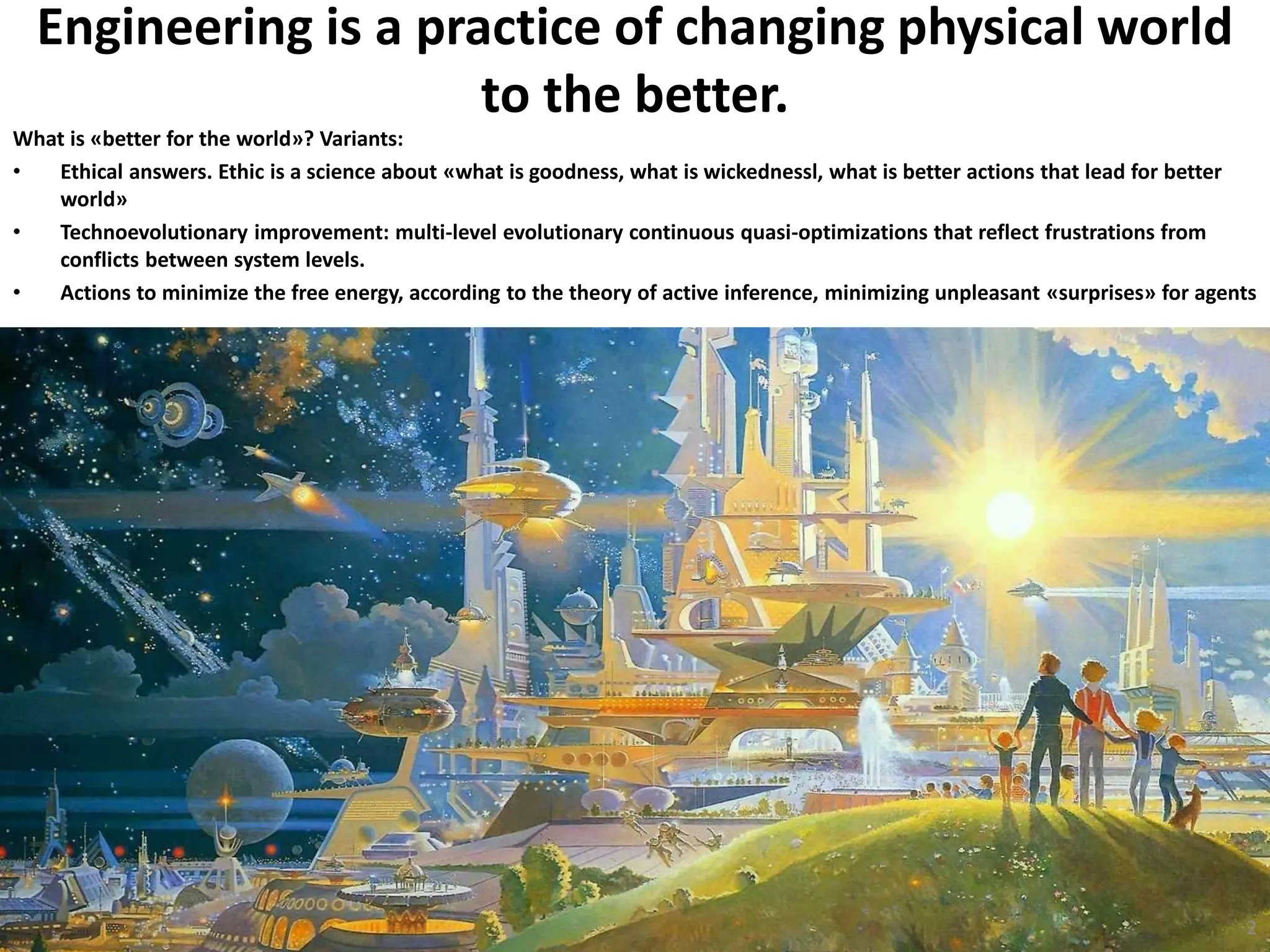 1. Engineering aims to improve the physical world for the better according to various definitions of better, such as ethics, technoevolutionary improvement, or minimizing unpleasant surprises.