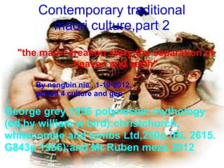 The document summarizes a Maori creation story about how heaven and earth were originally joined together in darkness until separated by the six sons of Rangi and Papa. The sons Tane-mahuta, Tawhiri-ma-tea, Tangaroa, Tu-matauenga, Haumia-tikitiki, and Rongo-ma-tane pushed heaven and earth apart so light could come into the world. In the process of separation, Tu-matauenga ate four of his brothers except Tawhiri-ma-tea, explaining modern human traits like fierceness, eating plants and animals, and storms.