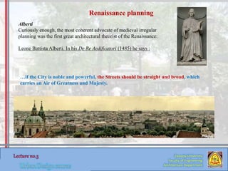 3) Renaissance cities featured more regular street grids than Alberti's winding streets, though flexibility remained. Urban planning centered public spaces like Florence's Uffizi courtyard.