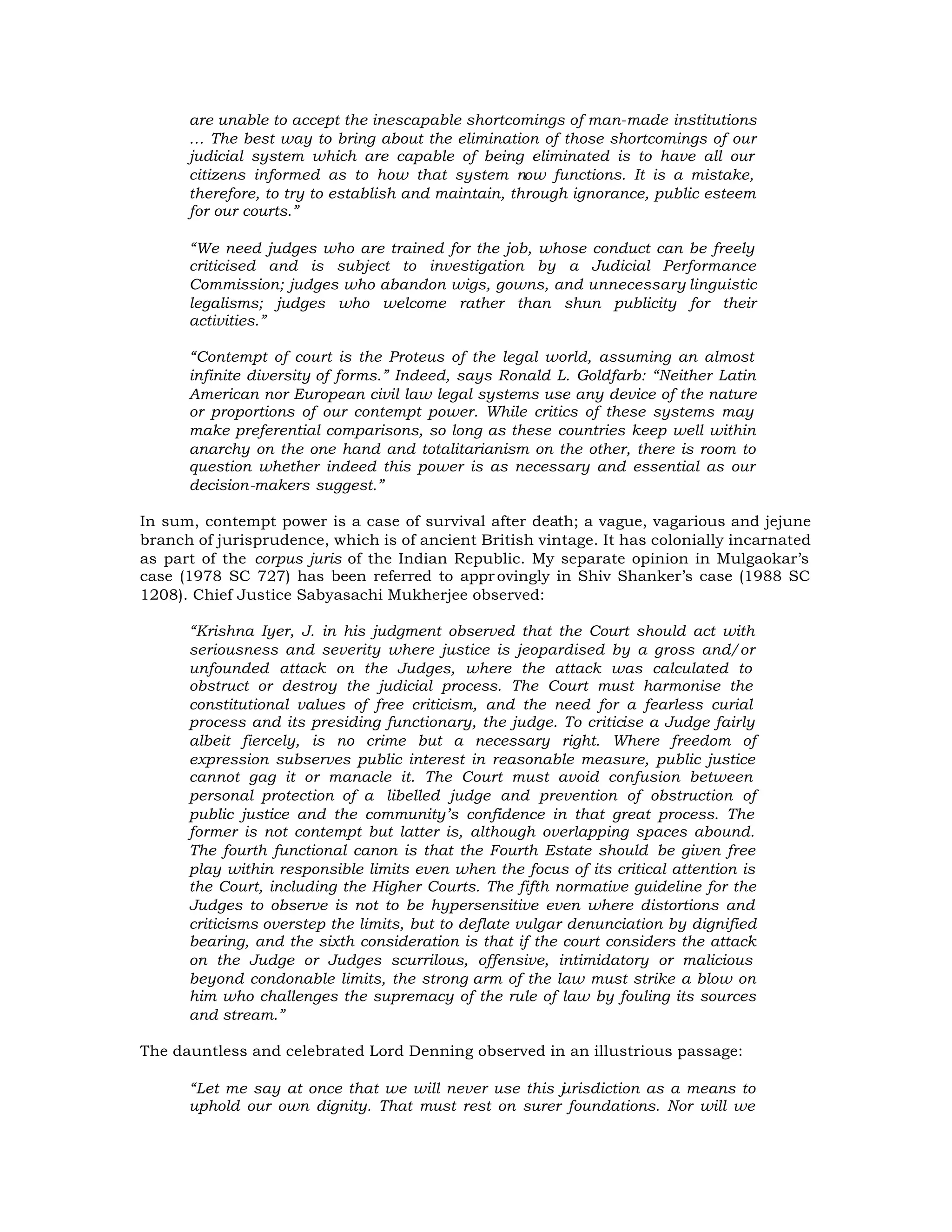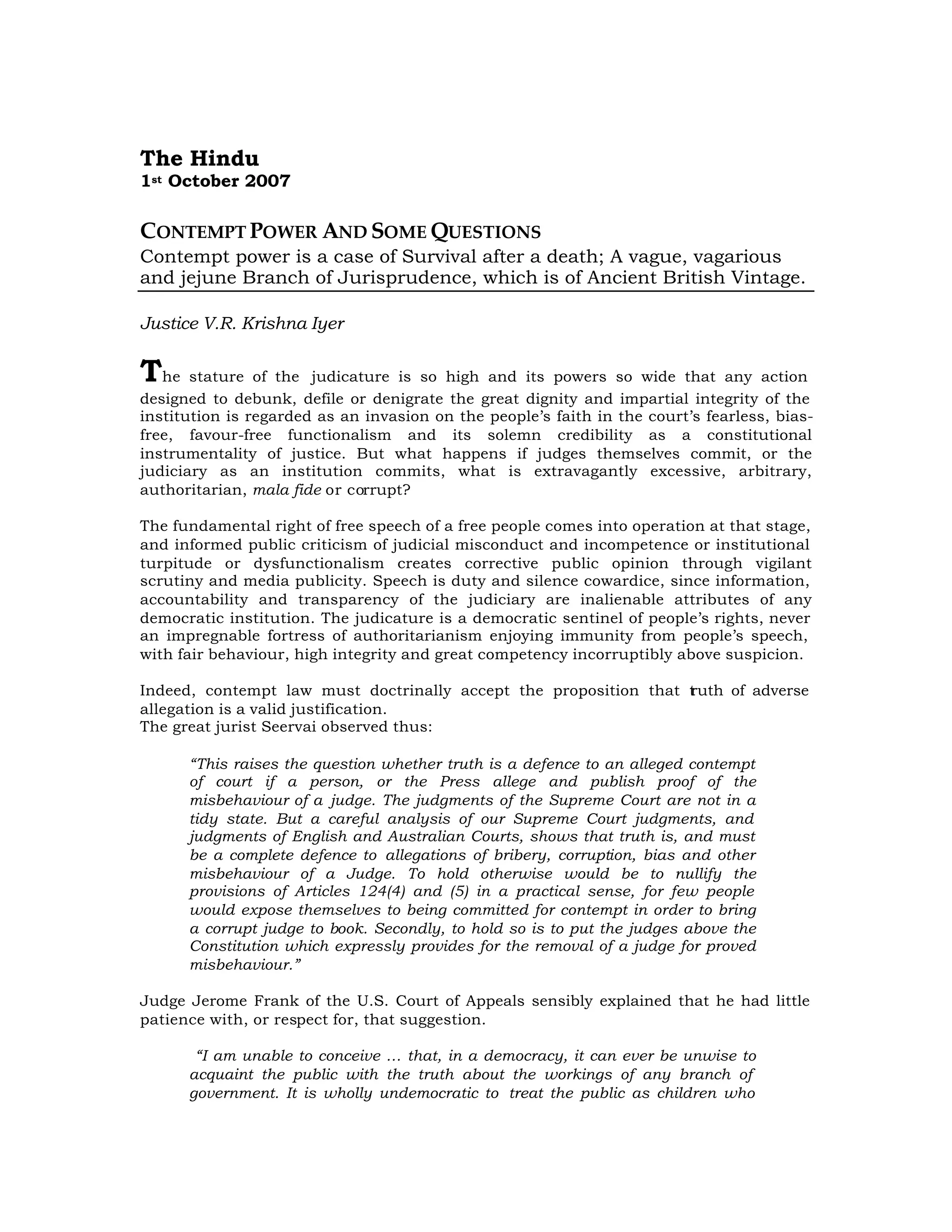 The document discusses the power of contempt in courts and questions around its use and limitations. It provides perspectives from several prominent jurists who emphasize that 1) while courts must uphold dignity and impartiality, truth should be an absolute defense against allegations of judicial misconduct; 2) free speech is important for transparency and accountability of democratic institutions like the judiciary; and 3) contempt powers should be used cautiously and not to shield judges from legitimate criticism, as integrity and competence are best upheld through the quality of judgments.