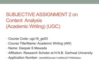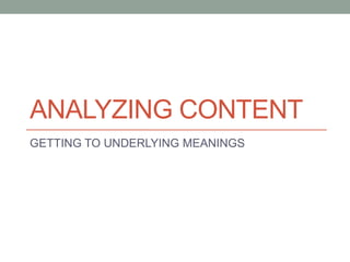 This document discusses content analysis as a research technique for systematically examining recorded information. It defines content analysis and outlines its uses and processes. Content analysis involves defining categories, measuring variables, and coding data for analysis. It can be quantitative or qualitative. Textual analysis examines meaning and power relations within texts, considering features, rhetoric, and relationships with other cultural artifacts. The purpose is to uncover dominant, negotiated, or oppositional meanings.