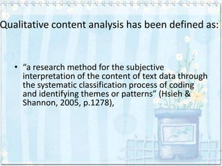 Qualitative content analysis is defined as the subjective interpretation of text data through systematic classification and coding to identify themes and patterns. It can be used with both qualitative and quantitative data in either an inductive or deductive manner. Content analysis is a valid research method used to make inferences from data and provide new insights. It involves preparing the data, organizing it into categories, and reporting the results. The trustworthiness of content analysis relies on clearly linking the data to the results.