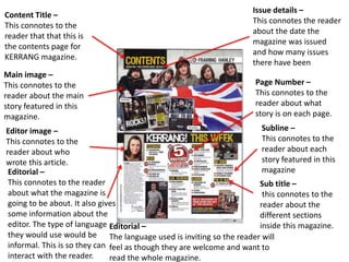 This document analyzes the design and layout of a music magazine contents page and double page spread (DPS). It identifies several conventions used, including main images, headlines, pull quotes, columns, page numbers, and facing pages. These conventions are meant to attract readers, guide them through articles, and provide key information in an accessible way. The conclusion notes that large spanning images, drop caps, columns, and educational information about artists should be repeated in the student's own magazine spread.