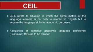 CEIL (Content English Integrated Learning) refers to using English as the medium of instruction to teach academic content subjects. The goals of CEIL include providing students with real purposes for learning English, motivating them by relating lessons to their interests, accelerating language learning, enhancing vocabulary, focusing on both language and content, and developing lifelong learning skills. Some challenges of implementing CEIL include finding qualified teachers, selecting appropriate content, developing sufficient teaching materials, establishing clear assessment criteria, and ensuring adequate exposure to English. CEIL is similar to CLIL (Content Language Integrated Learning) but uses English specifically rather than another foreign language. The document provides various strategies that can be used to integrate English and academic content, such as interactive games