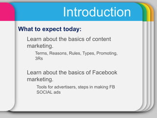 This document provides an overview of content marketing and Facebook marketing basics. It defines content marketing as the creation and sharing of content to promote a product or service. It discusses different types of content that can be used, as well as challenges like outdated content. It also covers the basics of creating and optimizing Facebook ads, including identifying goals, targeting audiences, and monitoring performance. The key aspects of both content marketing and Facebook advertising are summarized for a high-level understanding of the topics.