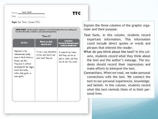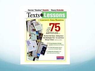 This document discusses using literacy centers for content areas like mathematics, social studies, and science. It introduces centers as an instructional tool and examines various content-focused center ideas. It also discusses assessment strategies for centers. Some center examples provided include vocabulary activities like concept sorts, concept maps, and word detectives. Sample reading strategies presented are KWL, DRTA, sketch-through-text, stop-and-write, and inquiry charts. Visual aids like graphic organizers are also mentioned as supports for comprehension.